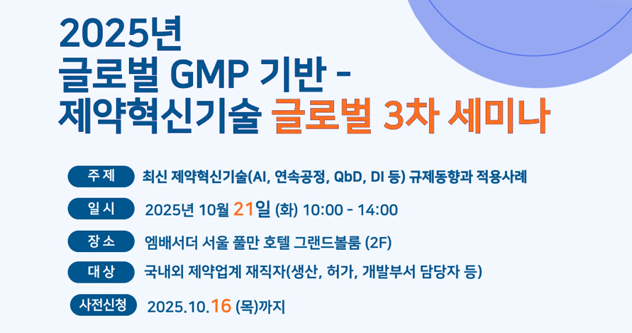 동국대학교 약학연수원에서는 식품의약품안전처 주관으로 "2025년 글로벌 GMP 기반 제약혁신기술 도입 - 제약 스마트 공장 혁신기술 교육 컨설팅" 연구 사업을 진행하고 있으며 이번 글로벌 세미나는 최신 제약 기술(AI, 연속공정, QbD, DI 등)의 FDA 동향과 적용사례를 중심으로 구성됩니다.